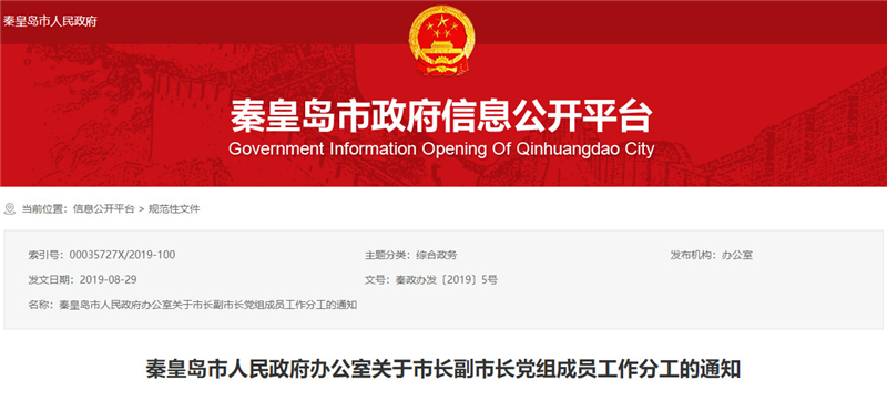 秦皇岛市人民政府办公室近日印发通知,根据市政府领导班子成员调整情况和工作需要,现将市长、副市长、市政府党组成员工作分工通知如下↓↓↓